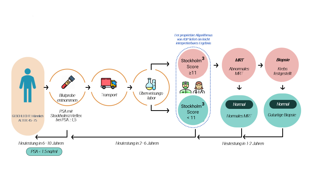 Um diese bahnbrechenden Forschungsergebnisse in die klinische Praxis zu überführen, wurde A3P Biomedical gegründet. Das Unternehmen spielt eine zentrale Rolle bei der Implementierung des Stockholm3-Tests und setzt sich dafür ein, dass Männer weltweit von dieser innovativen Diagnostik profitieren. Der Name A3P steht für Algorithm with 3 modalities (genetics, proteins, and clinical data) in prostate cancer und spiegelt das Ziel wider, Prostatakrebs präzise und frühzeitig zu erkennen. Dieses Versprechen erfüllt A3P Biomedical durch die überzeugenden Ergebnisse des Stockholm3-Tests. Groß angelegte klinische Studien belegen den revolutionären Nutzen des Tests: Er senkt die Zahl unnötiger Prostatabiopsien um bis zu 50 Prozent und verbessert gleichzeitig die Früherkennung aggressiver Formen von Prostatakrebs. Für die Patienten bedeutet dies weniger Ängste und Komplikationen sowie eine deutlich höhere Chance, die Krankheit in einem heilbaren Stadium zu diagnostizieren.